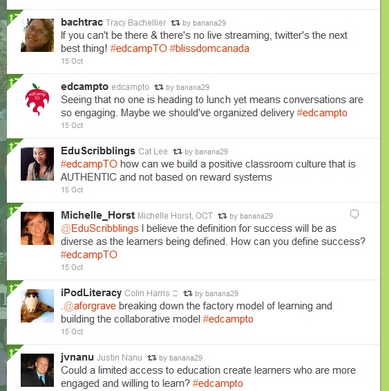 This past Saturday was the inaugural session of EdcampTO. I couldn’t go because of all my other commitments, but between working on my inquiry project and the other responsibilities, I followed the #edcampto hashtag.