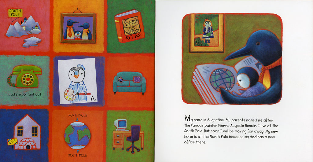 | Description | Augustine, a young penguin from the South Pole, moves with her family to the North Pole. She overcomes the initial awkward feelings of loneliness through her art. Her drawings help her connect to her new school community. |