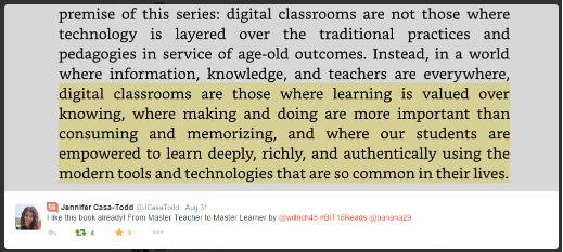 Jennifer Casa-Todd is reading Will Richardson’s book and she tweeted early into her book with a snapshot of the book (maybe an e-version?) of a quick quote she approved of.