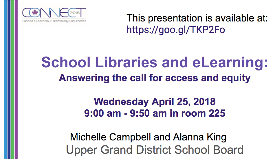Michelle Campbell and I presented at CONNECT 2018 in Niagara Falls this week. After some very encouraging conversations at Treasure Mountain Canada in October, we decided to take our ideas about the intersection of school libraries and eLearning success to the wider audience at this conference. CanConnect attracts some of the greatest education influencers in the province, if not the country and has the power to implement our ideas and philosophy nationwide.